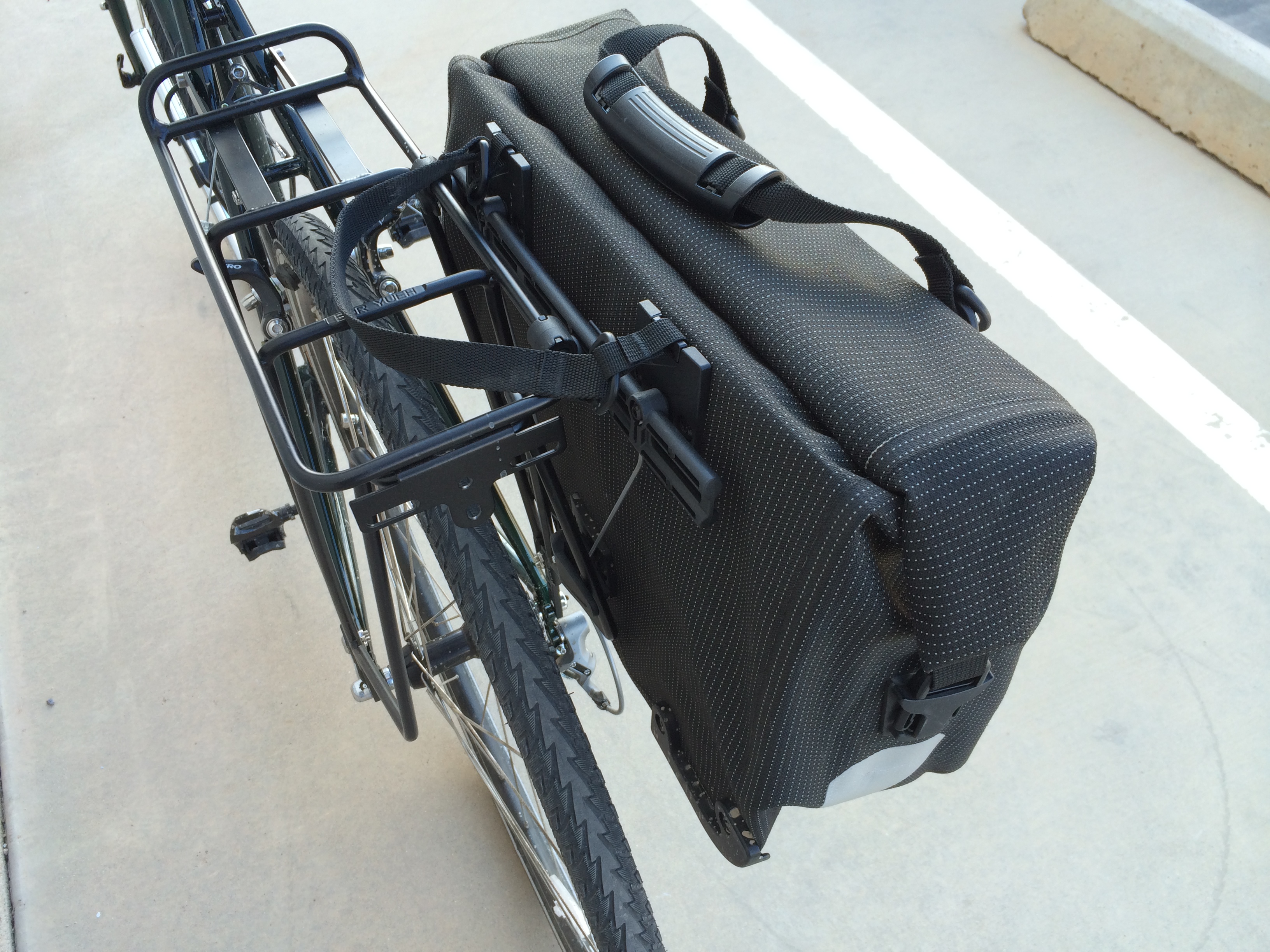 While it’s not lightweight (1730g for the one side vs 1440g for a pair of Front Roller Plus bags) it does hold 21L/1282 cu. in.  It’s enough to take one change of clothes, a small laptop (Asus T100 transformer Book  & accessories), and lunch.  From the specifications and the reviews, it’s waterproof which should help if I get caught in one of Southern Arizona’s epic monsoons.